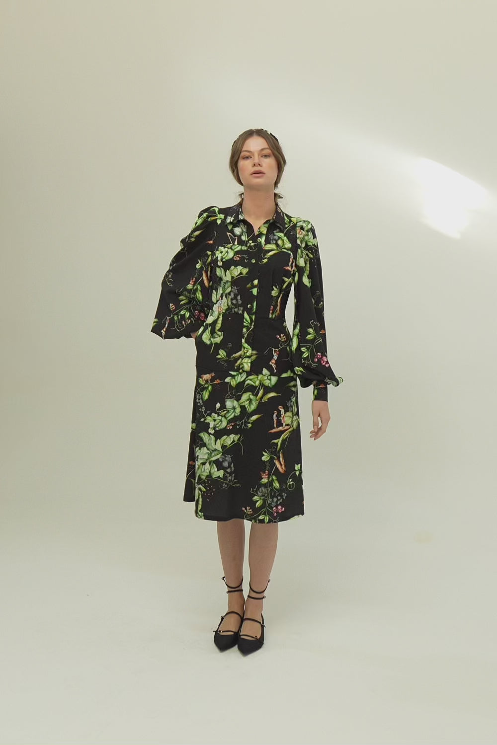 A-line midi dress, cinched at the waist with long puff pleated sleeves, chest panels, and darts in chest. It's collared, buttoned down, and has horizontal panels in waist and mid-thighs.